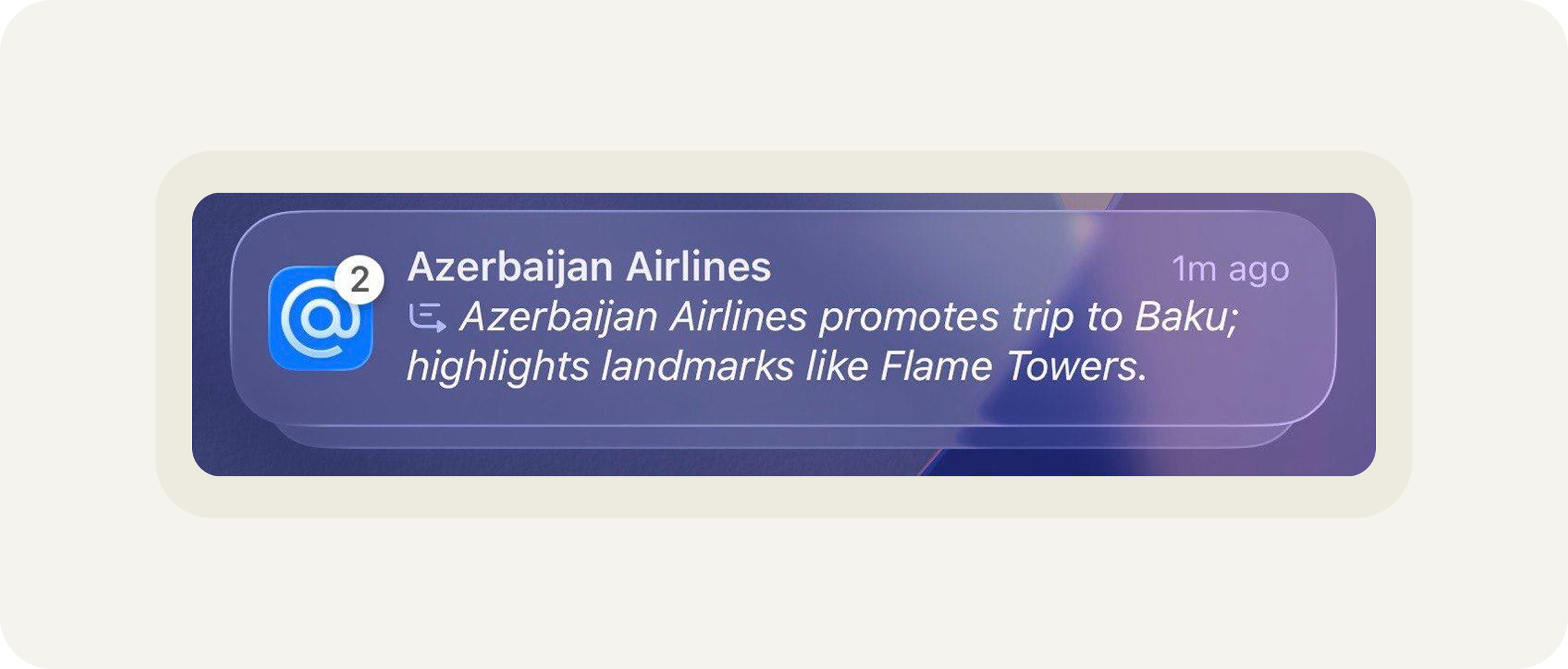 В iOS 26 появилась новая функция — Apple Intelligence. Это система искусственного интеллекта, которая умеет распознавать основной посыл письма и сообщения. Вместо привычного заголовка и прехедера клиент теперь может увидеть на экране блокировки краткий пересказ — то, что ИИ посчитает главным.