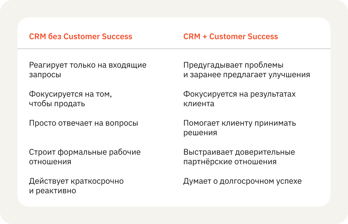 Ещё важно, что и CRM, и Customer Success объединяются вокруг данных. CRM превращается в главный операционный инструмент, где хранятся не только данные о транзакциях и коммуникациях, но и данные о реальном использовании продукта и достигнутых результатах. Это позволяет предсказывать возможные проблемы заранее, видеть, когда клиенту нужна помощь, строить персональные сценарии развития.