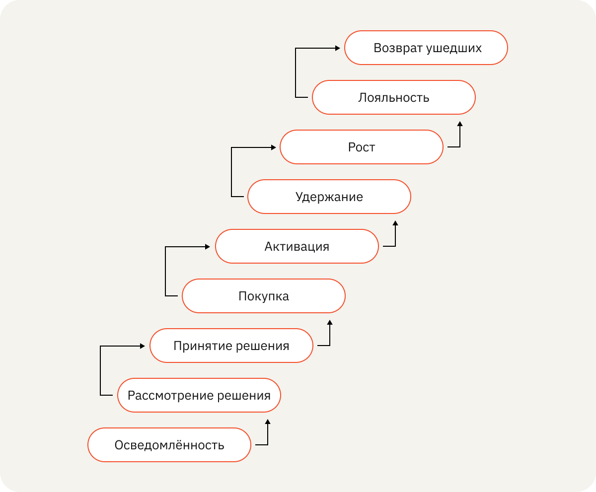 Обычно здесь выделяют стадии осведомлённости, рассмотрения, принятия решения, покупки, активации, удержания, роста и лояльности, а также (что редко) — стадию возврата ушедших клиентов.