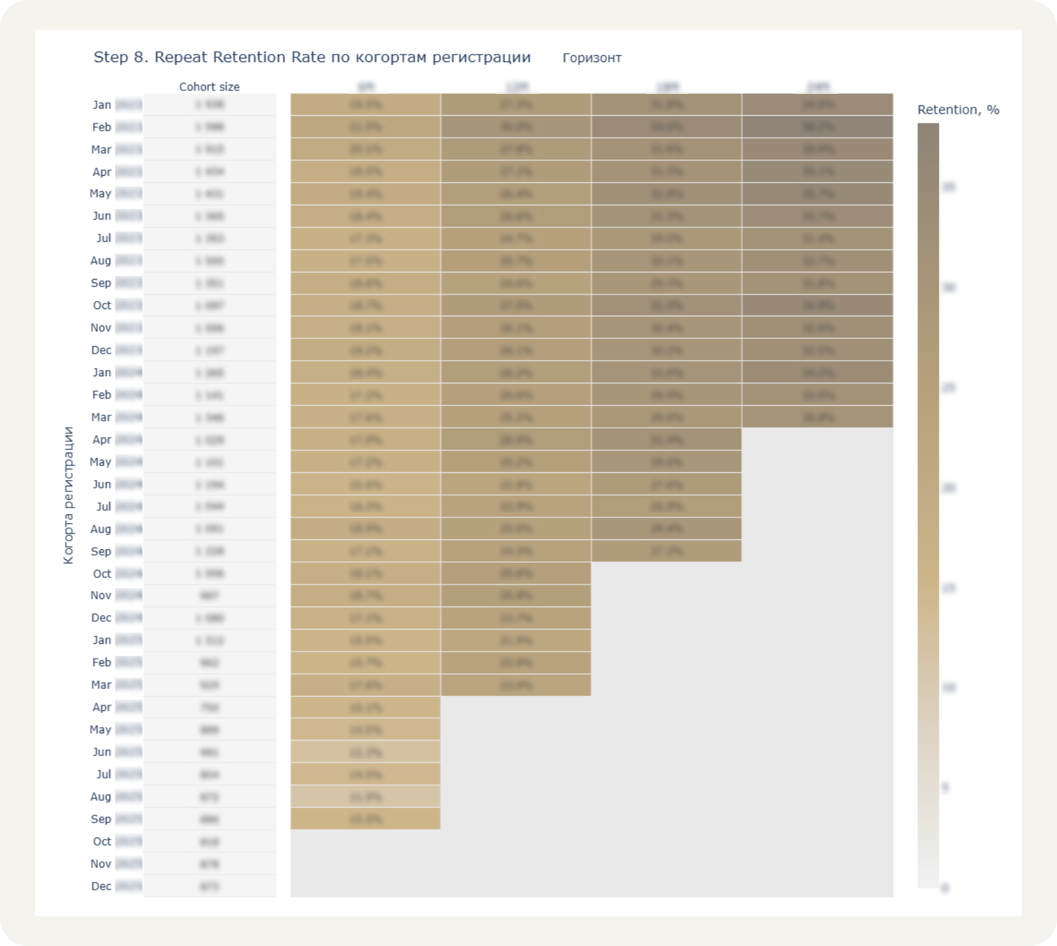Сначала мы собрали базовую структуру данных: траектории клиентов, последовательность заказов, временные интервалы между ними. Это позволило увидеть не только факты покупок, но и динамику. Далее перешли к когортному анализу. Сравнение когорт регистрации показало, как меняется поведение новых клиентов во времени и как на него влияют внешние факторы.