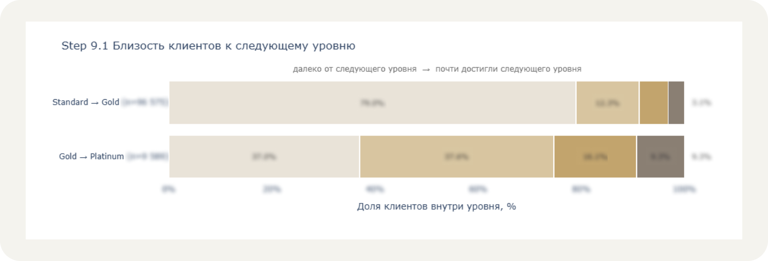Отдельным блоком был анализ дистанции до следующего уровня. Мы проверяли, влияет ли близость к уровню Gold или Platinum на вероятность следующей покупки. Это позволило оценить их реальную мотивационную силу.
