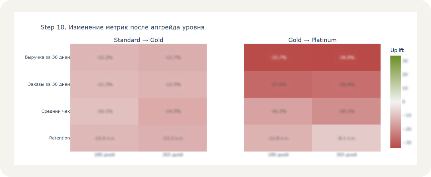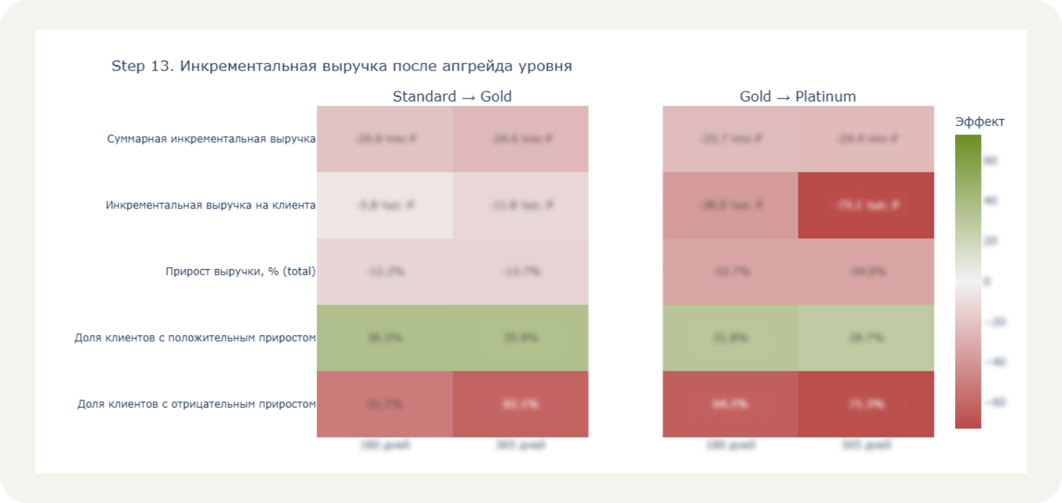 Четвёртый инсайт стал самым важным для оценки всей программы. Апгрейд уровня не создавал дополнительной ценности. Ни выручка, ни частота, ни удержание после перехода не увеличивались. Более того, инкрементальная выручка в анализируемых окнах была отрицательной. Это означает, что программа не усиливает поведение клиента, а лишь фиксирует уже сформировавшийся паттерн.