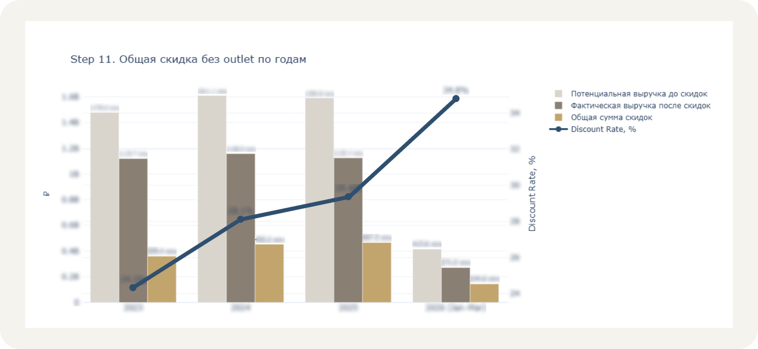 Параллельно мы считали экономику программы. Важно было разделить общую скидочную нагрузку и стоимость самой программы лояльности. Без этого любые выводы о её эффективности были бы некорректны.