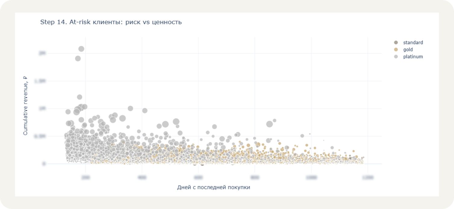 Дополнительно рассчитали исторический LTV по когортам и выделили ключевые сегменты: зоны роста, клиенты, близкие к переходу на следующий уровень, и клиенты с высоким риском оттока.