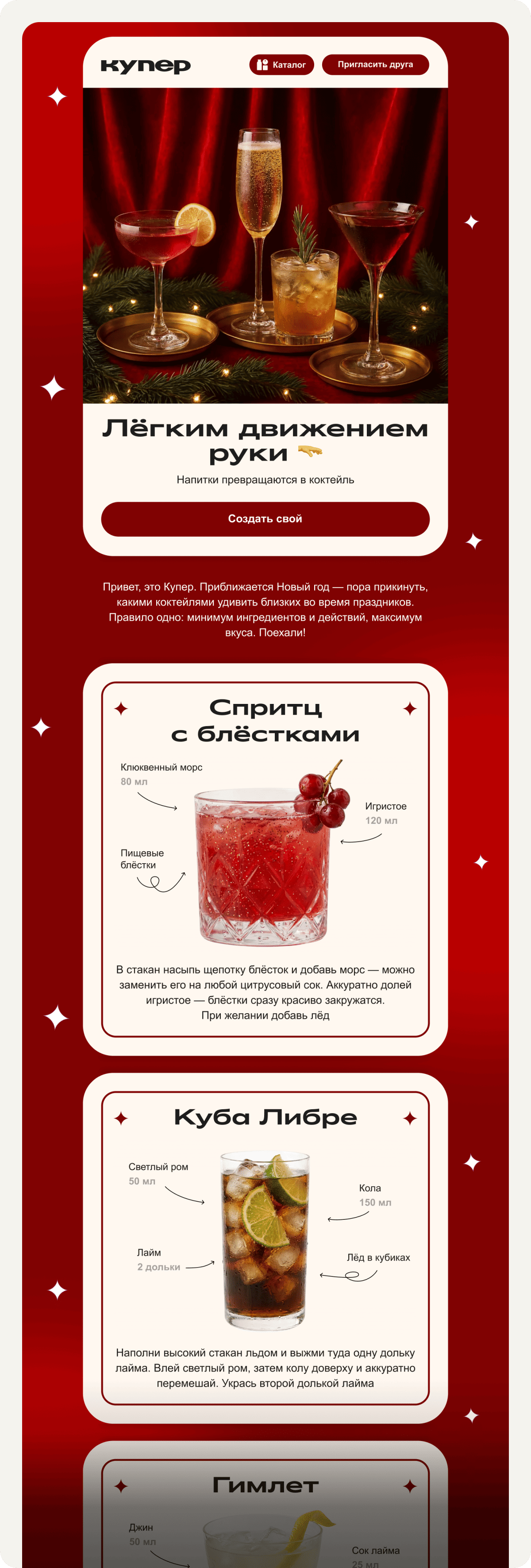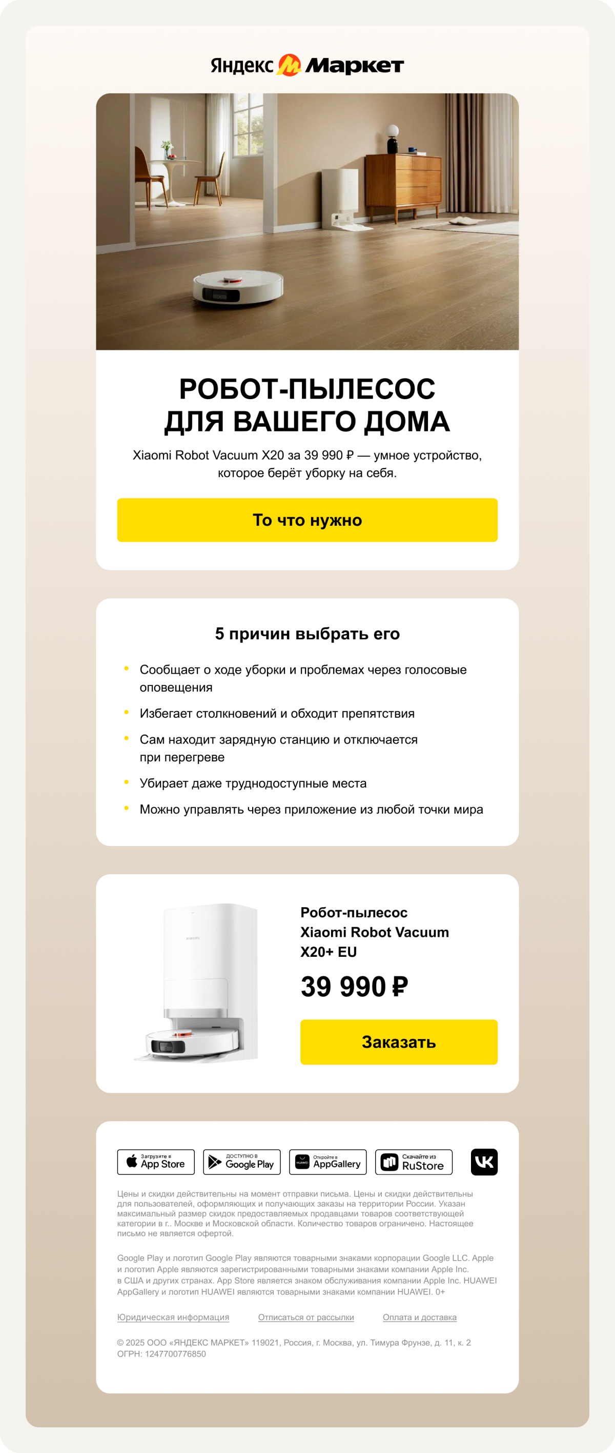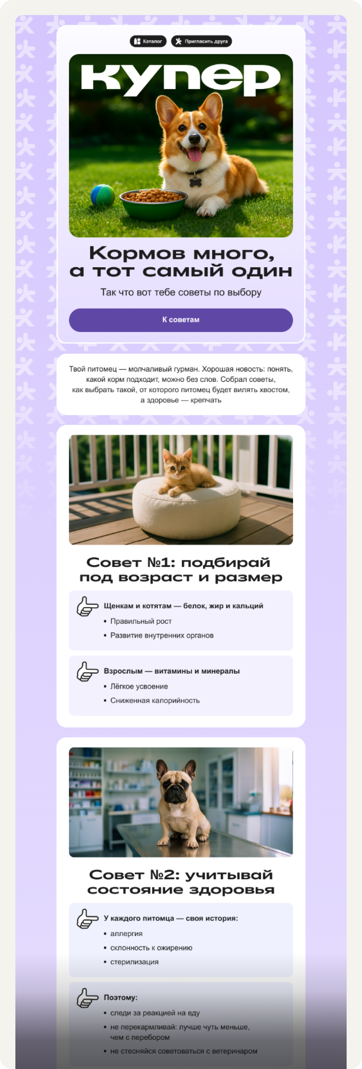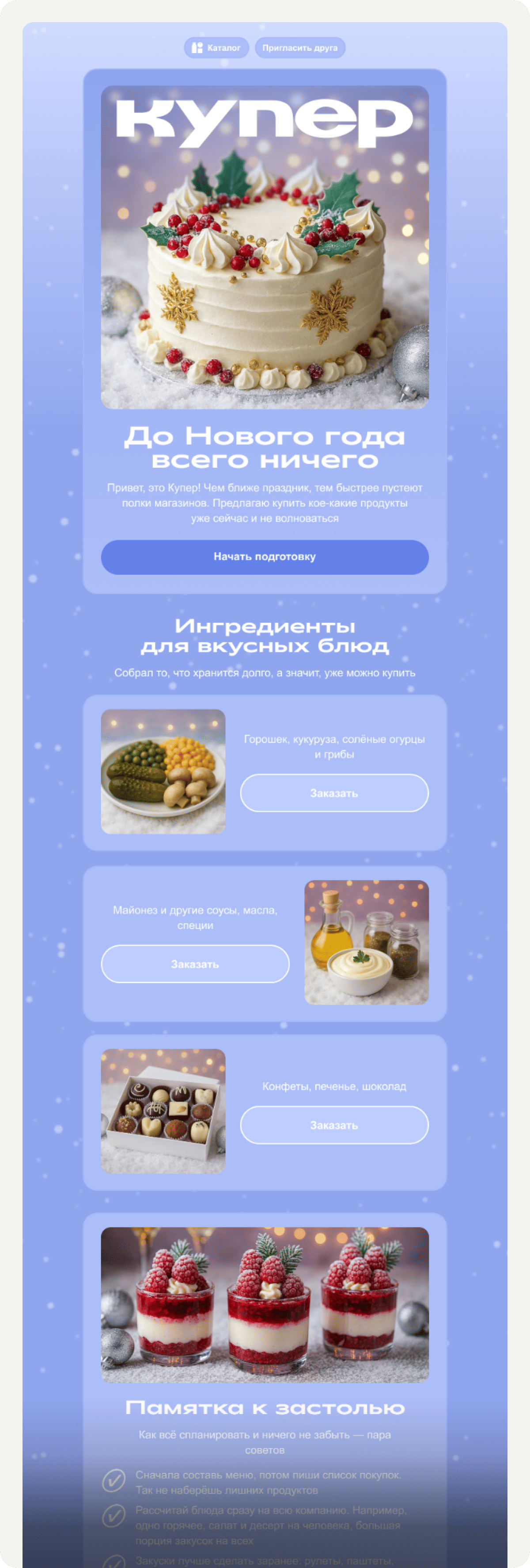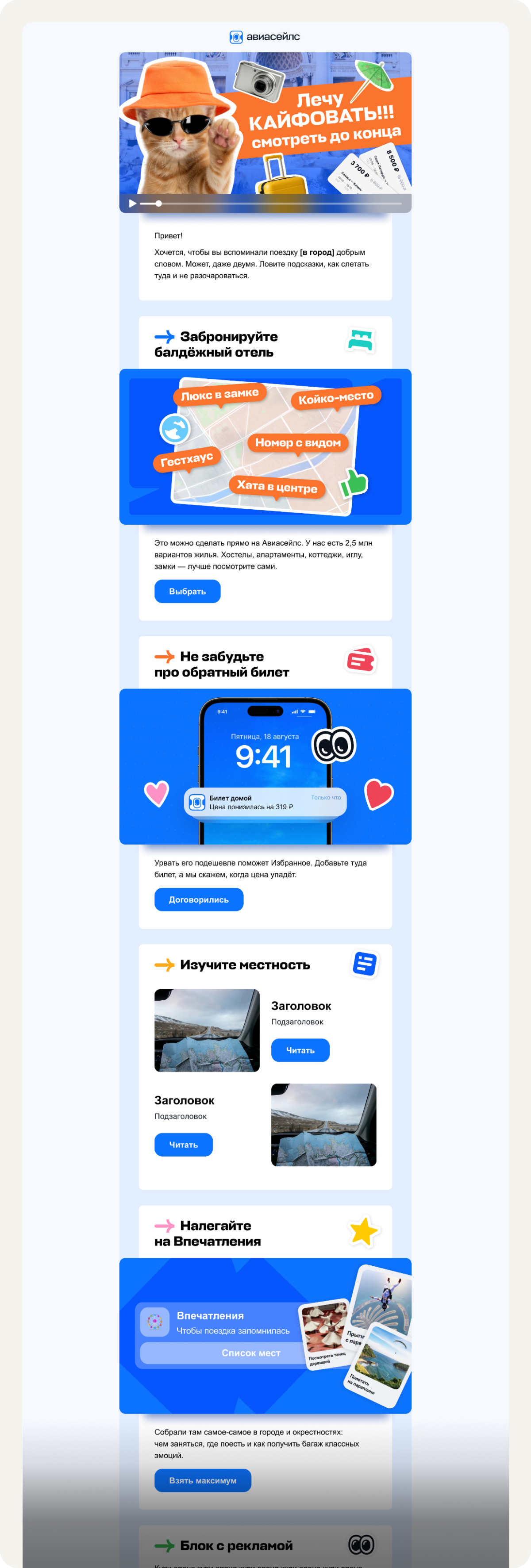Письма становятся ближе к качественным медиа-форматам. Они информируют, сопровождают, объясняют и поддерживают. Продажа при этом встраивается в коммуникацию естественно и ненавязчиво. Дизайн удерживает внимание, но не перегружает пользователя агрессивными визуальными приёмами.