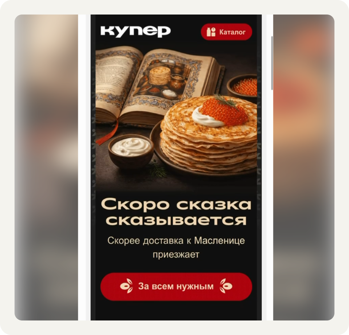 Первый путь — идти от логики соответствия. Когда продукт действительно органично вписывается в выбранную концепцию. Масленица, блины, домашние посиделки — доставка продуктов идеально ложится в эту историю. В таком случае стилизация усиливает естественную связь между поводом и оффером.