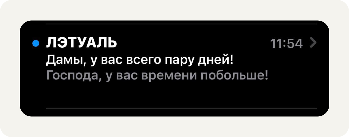 ЛЭТУАЛЬ очень аккуратно вышли из ситуации. Им нужно было подсветить подарки к 23 февраля, то есть фактически подарки для мужчин, но при этом они не «обрубили» коммуникацию только для женской аудитории. Формулировка темы, где упоминаются и дамы, и господа, приглашает открыть письмо и мужчин, и женщин. Каждый в этой конструкции может почувствовать персонализацию.