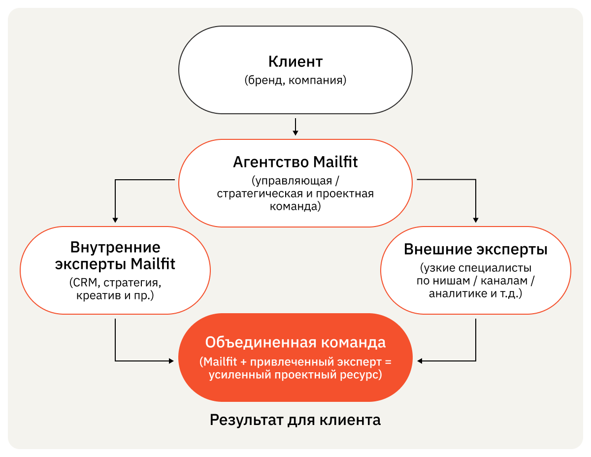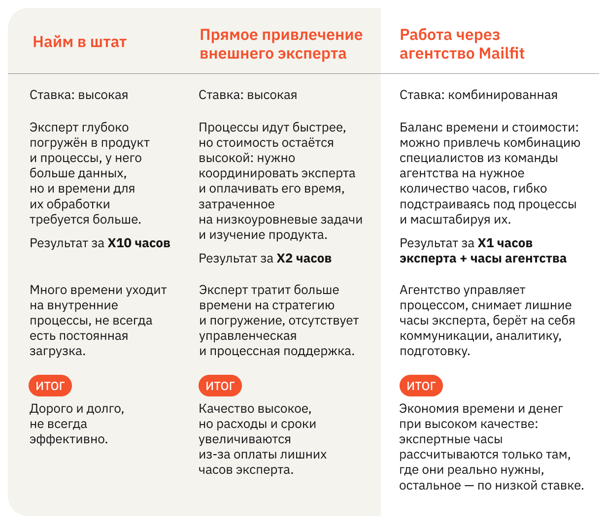 При необходимости Mailfit подключает внутренних специалистов агентства — аналитиков, дизайнеров, копирайтеров, маркетологов — чтобы часть задач выполнялась по более доступным ставкам без потери качества. Это снижает общие расходы бренда на проект.